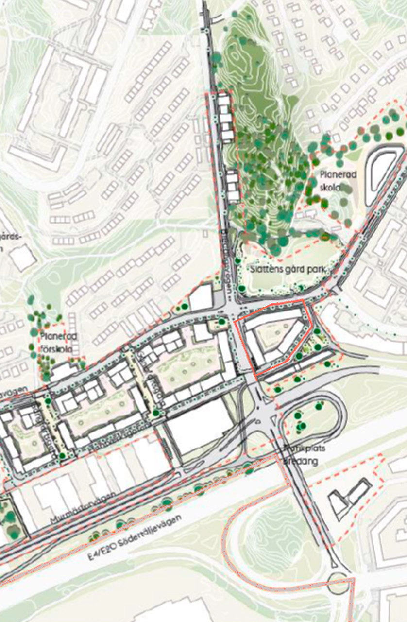 The area around Bredäng’s interchange, which today forms the entrance to Bredäng and Mälarhöjden, will be developed into a vibrant and functional mixed urban district. It will help to bring the two socio-economically differing areas together and will serve as a meeting point between the two. Aspects that support such a development are the school located just east of HSB’s block and the Slättgårdspark to the north. The park is the unifying urban space in the new urban fabric and since the block faces the park, we suggest creating a high amount of commercial space facing the park.