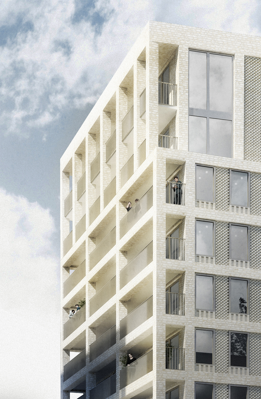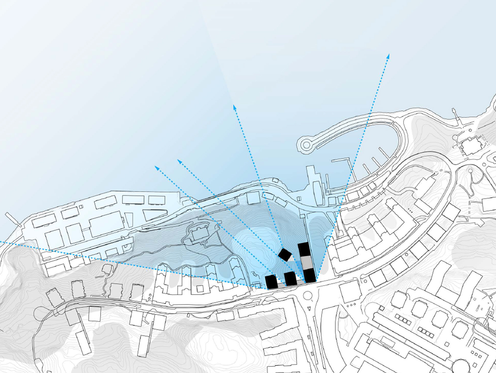 We developed our volumes in relation to the existing increase in scale from west to east, but also by playing with the sequence of high-rise buildings which you encounter as you proceed into the district. The highest gable facing the square marks the end of the development which together with the other volumes forms a backside towards the square. The arcade running along the square opens up to the water, which provides the area with transparency while the presence of the horizon counterbalances the overall vertical expression of the proposal.