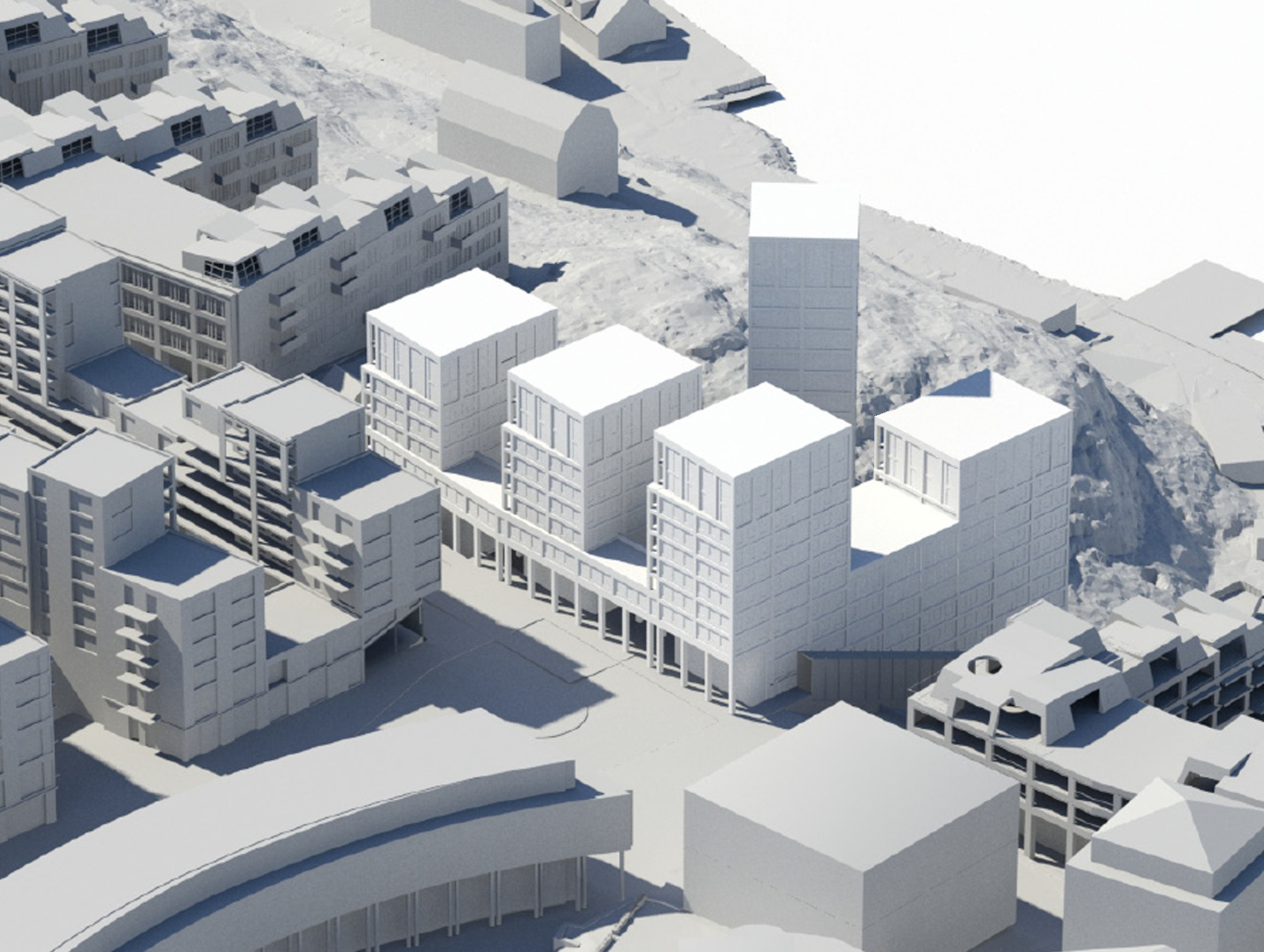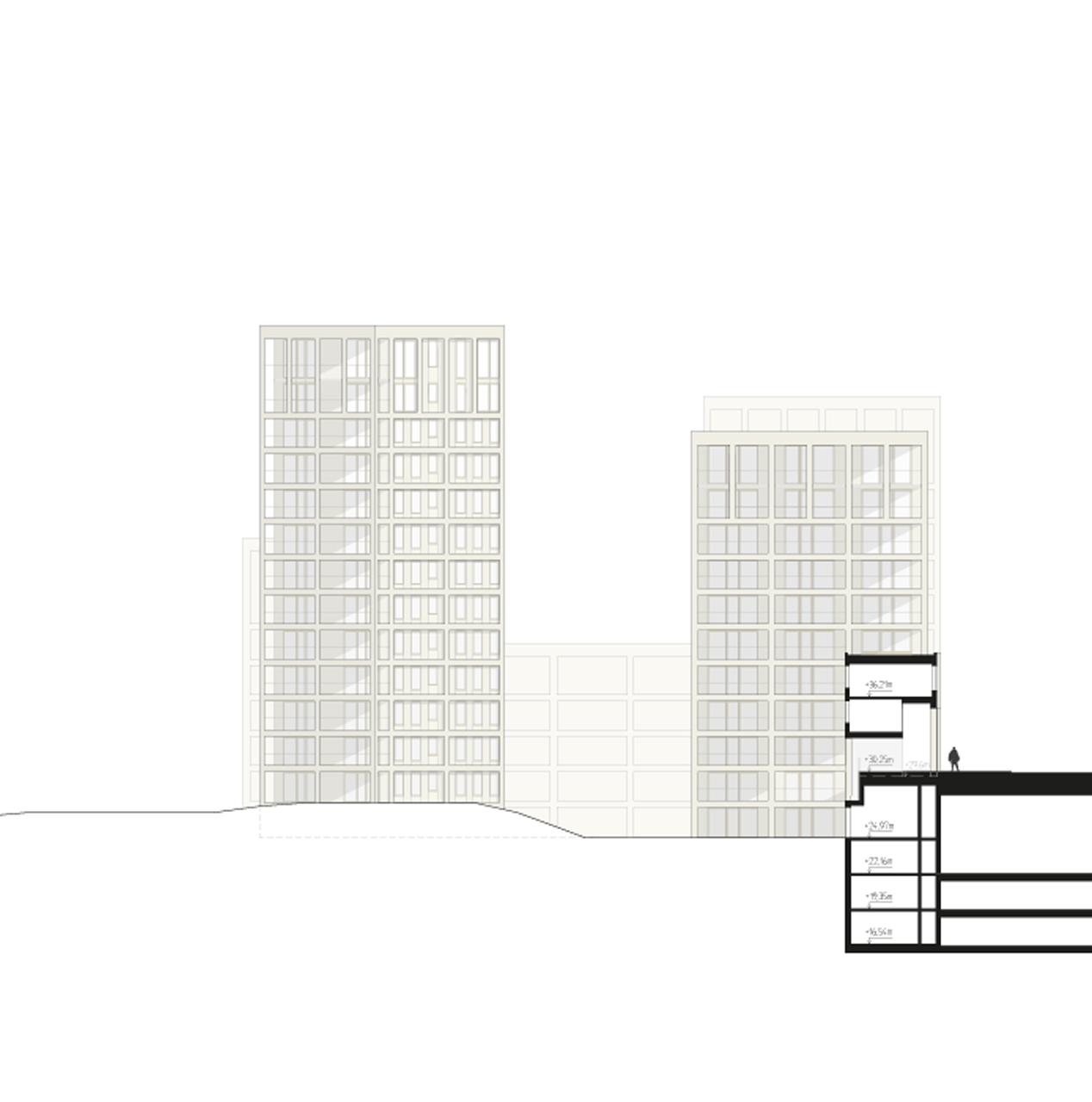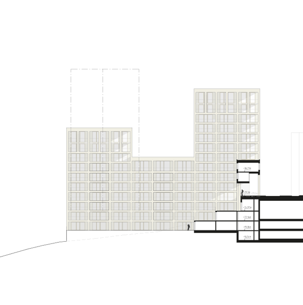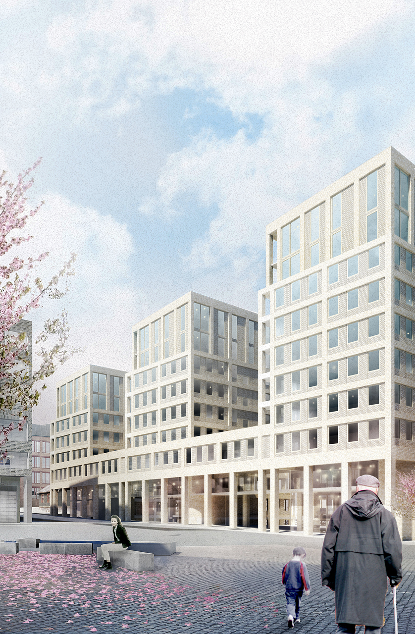Along the square, we have adapted the structure to the human scale by defining a low plinth, its arcade and the round volumes found in the existing office buildings. We also relate to surrounding volume heights with indentations in the two upper floors. We are less considerate with regard to the water as we instead relate to the waterfront’s scale and emphasise the height difference between the upper and lower sections of the area. The new proposal shifts the centre of gravity from the office building in the east towards the centre of the entire district, thereby improving the balance and harmony of the area as a whole.