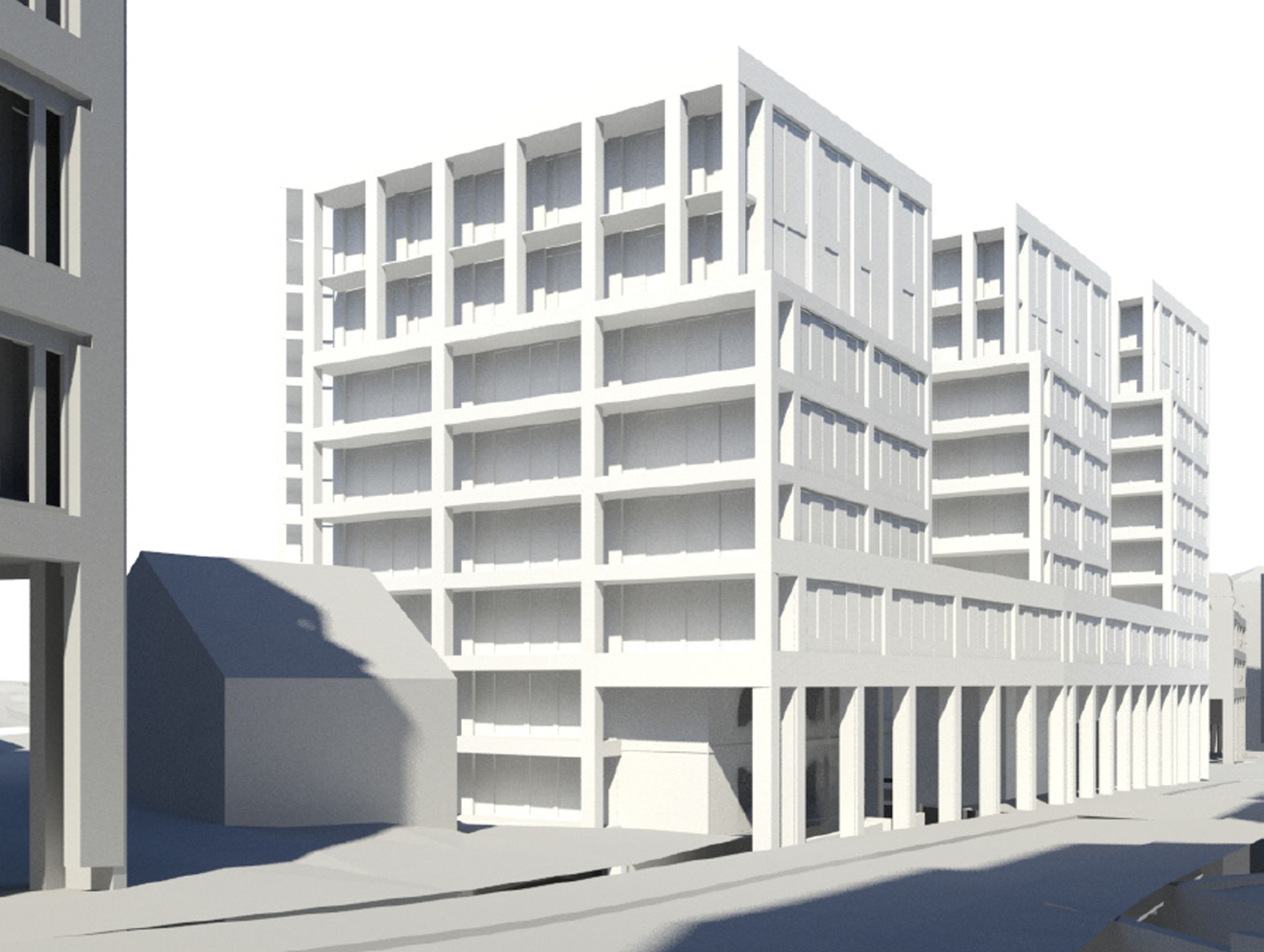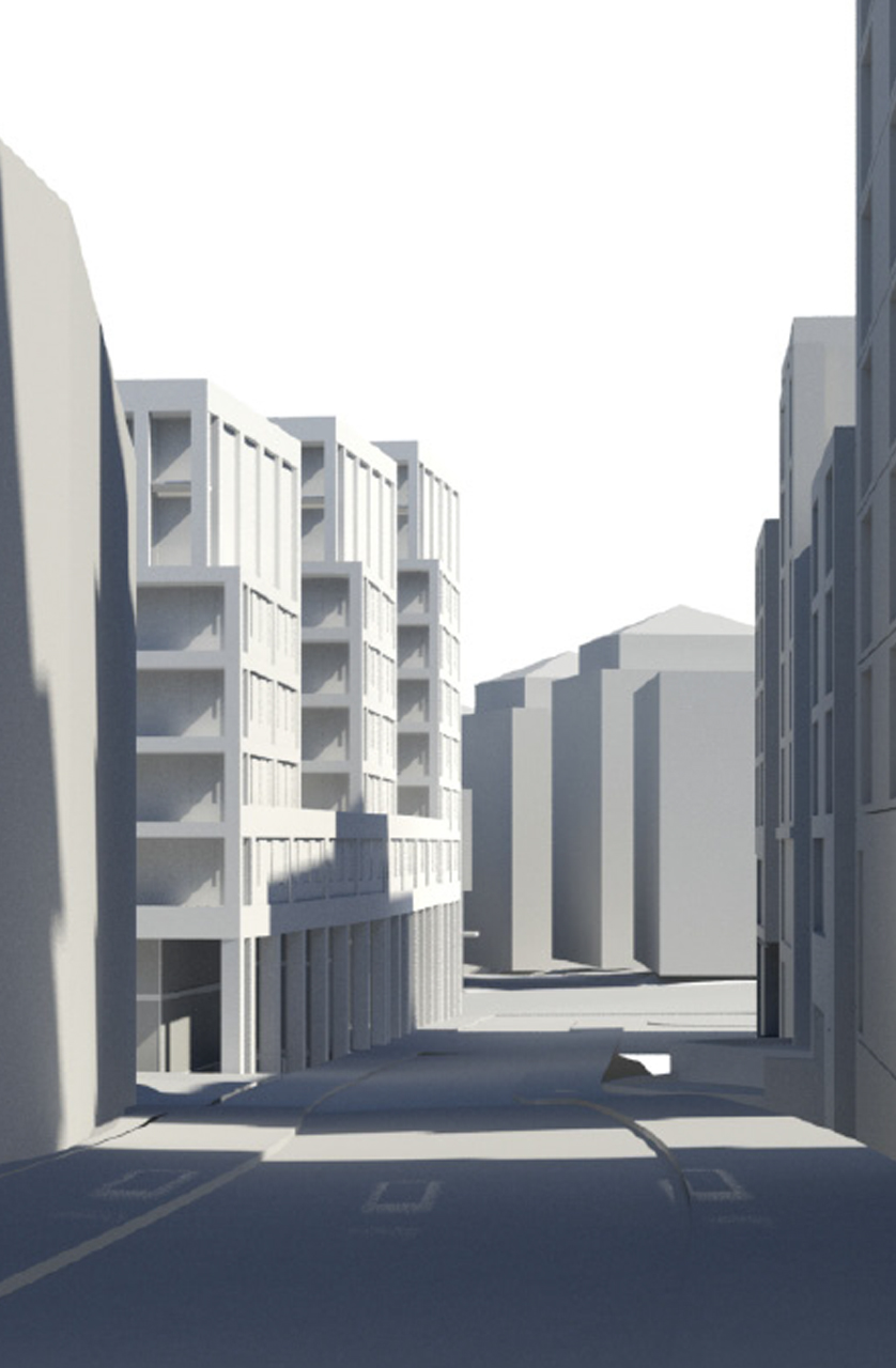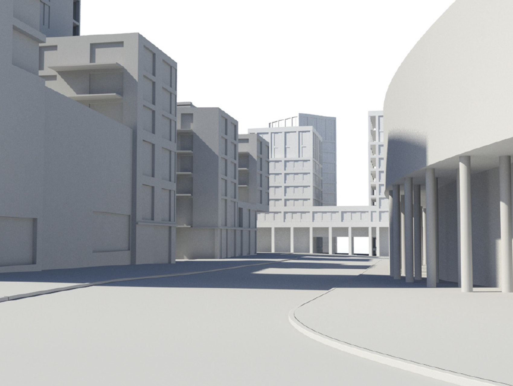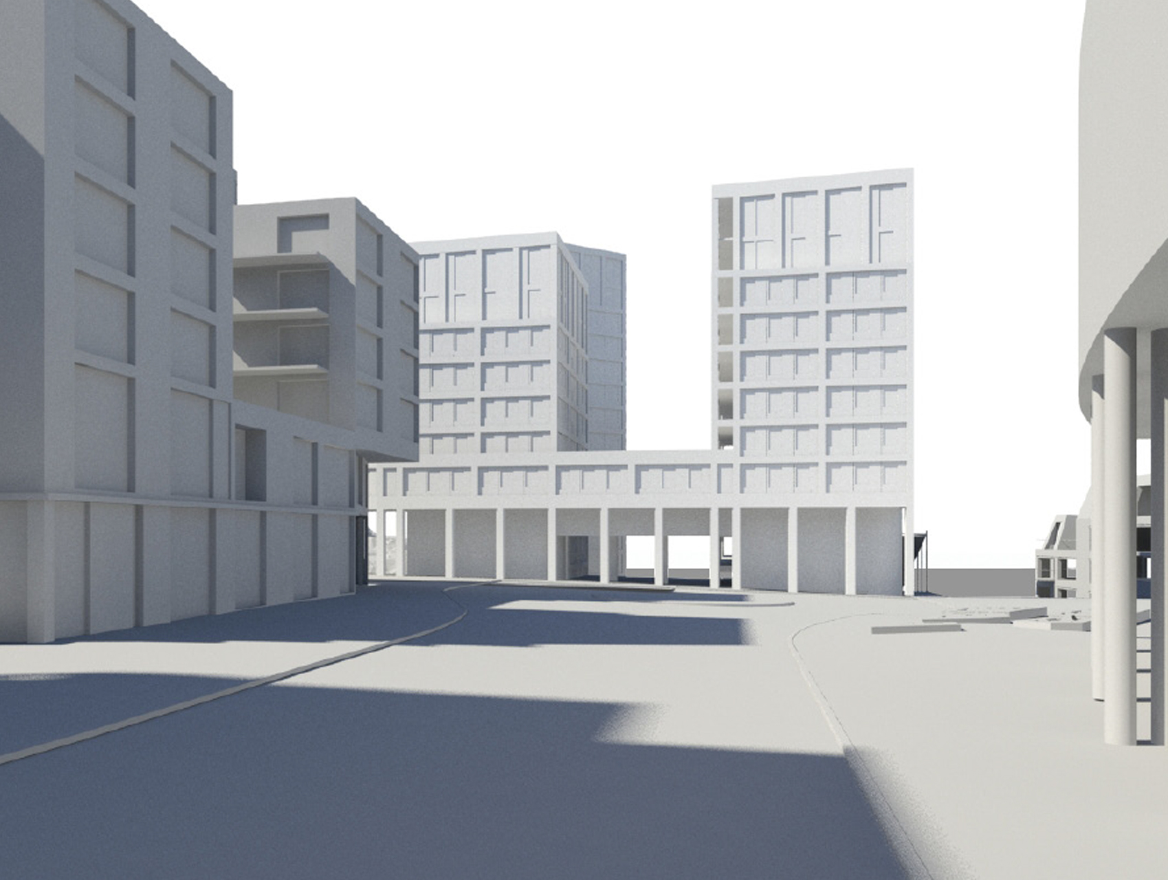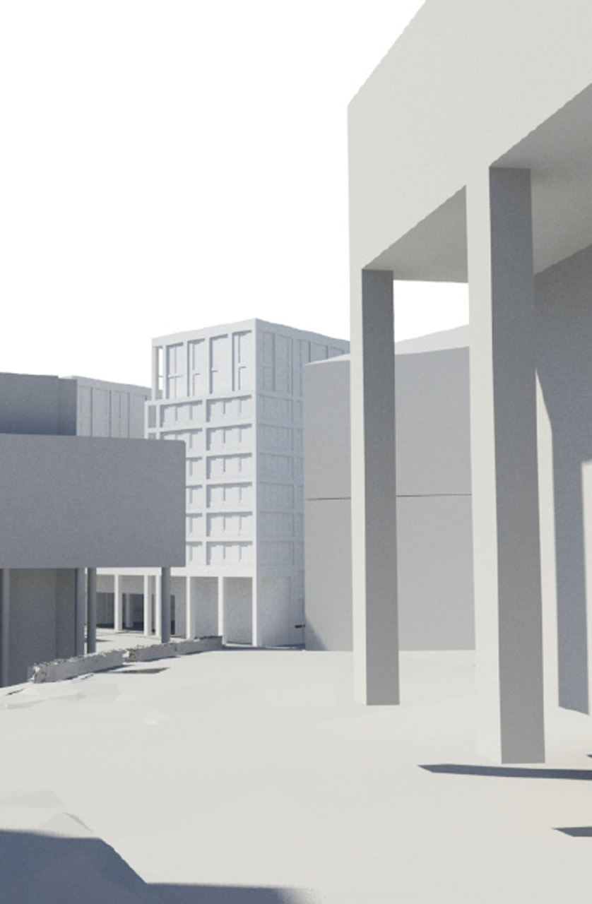 Along the square, we have adapted the structure to the human scale by defining a low plinth, its arcade and the round volumes found in the existing office buildings. We also relate to surrounding volume heights with indentations in the two upper floors. We are less considerate with regard to the water as we instead relate to the waterfront’s scale and emphasise the height difference between the upper and lower sections of the area. The new proposal shifts the centre of gravity from the office building in the east towards the centre of the entire district, thereby improving the balance and harmony of the area as a whole.