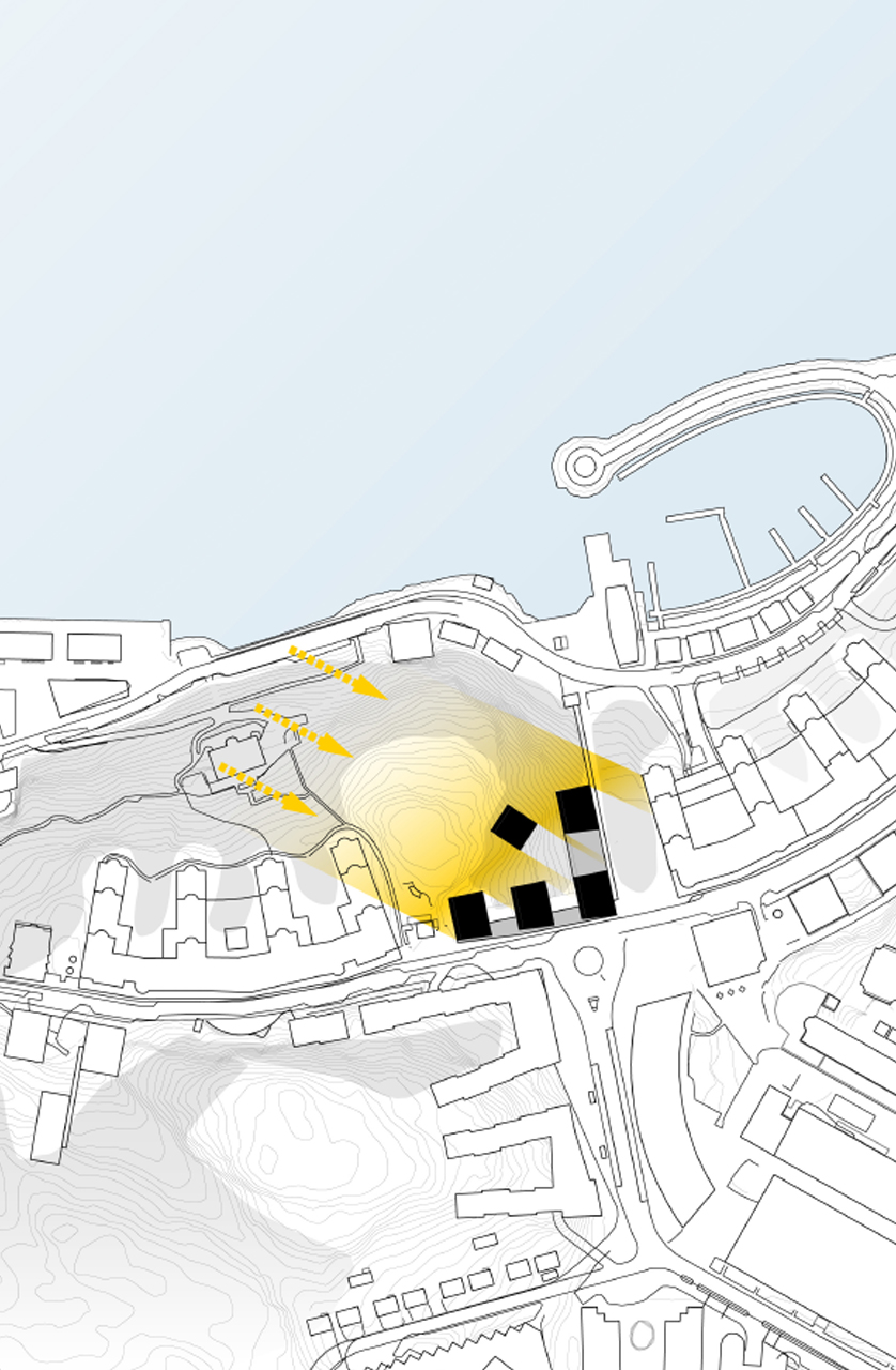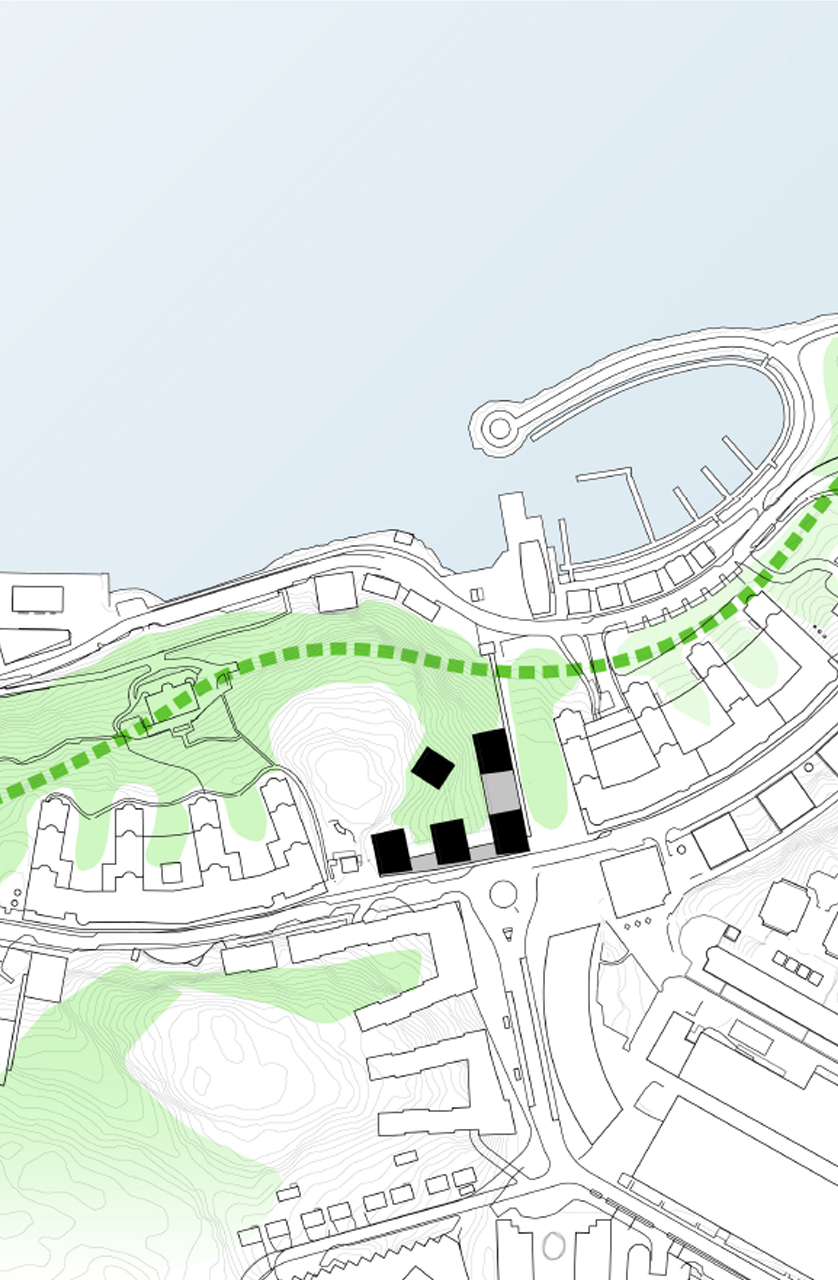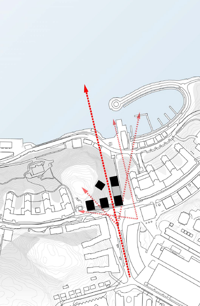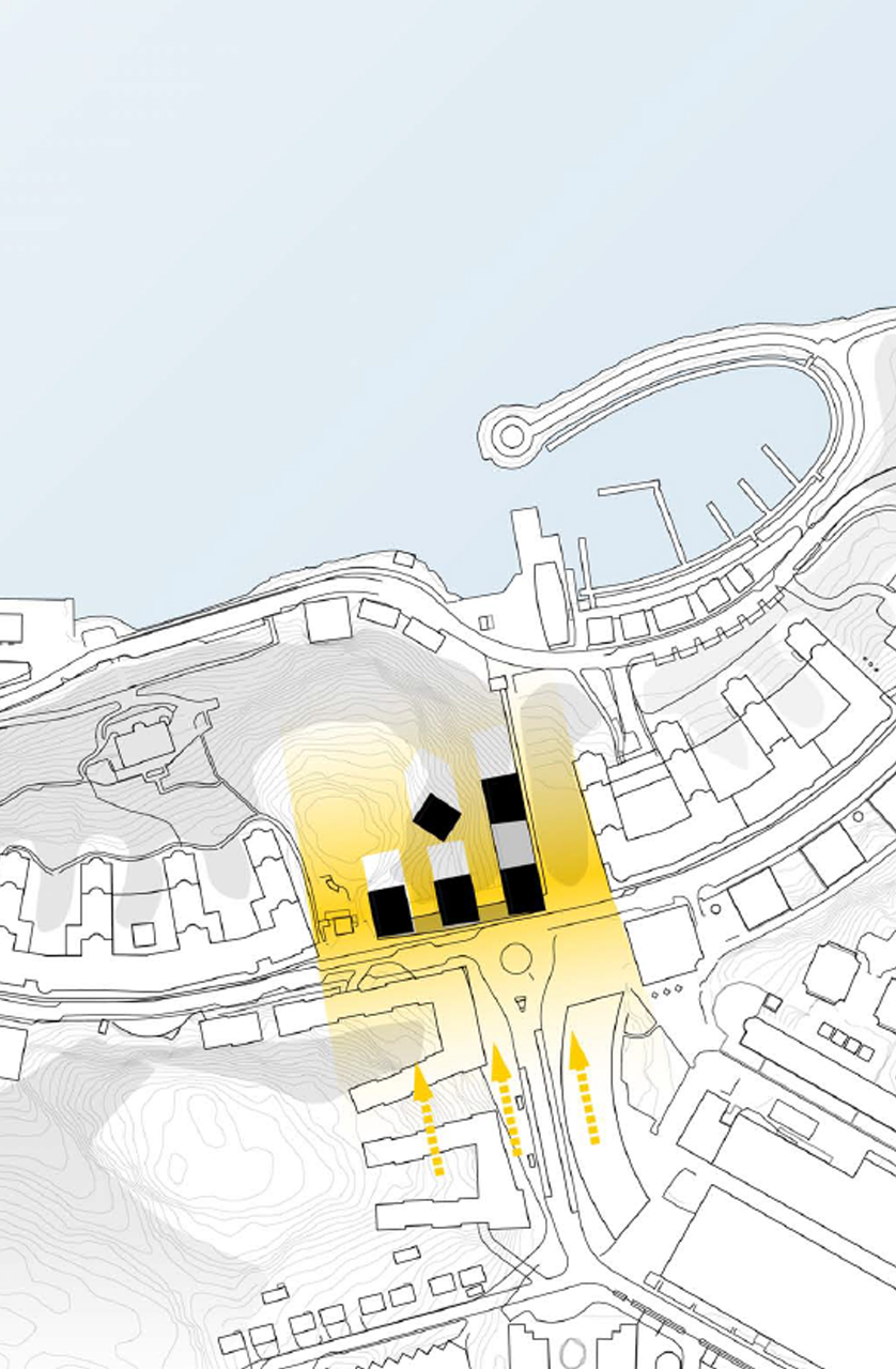 The Nacka Strand area is largely characterized by the development of the 1980’s and 1990’s in which existing industrial buildings, workers’ homes and high-rise housing have been woven into a new and well thought through urban context. Our proposal for a new housing block in the center of the bus square has been based on the same principle. The design intends to relate to – and in some cases enhance – the site’s existing features: the street’s façade patterns, the dramatic topography and the transition between varying scales.